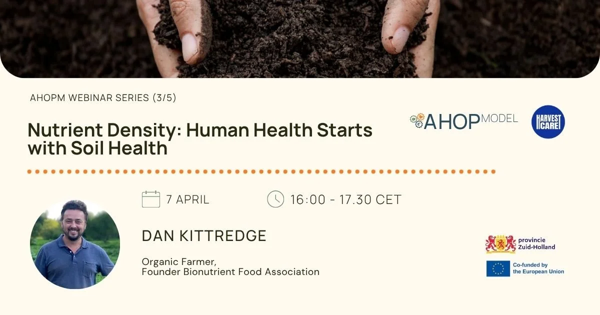 This webinar was part of the wider Agri-Health webinar series, made possible by the EIP-Agri subsidy from the Province of South Holland and the European Union. Within the AHOPM consortium, we are working on connecting agriculture, healthcare, and impact finance, with the aim of making healthy food a structural part of the healthcare system while creating new market opportunities for organic and regenerative farmers.
